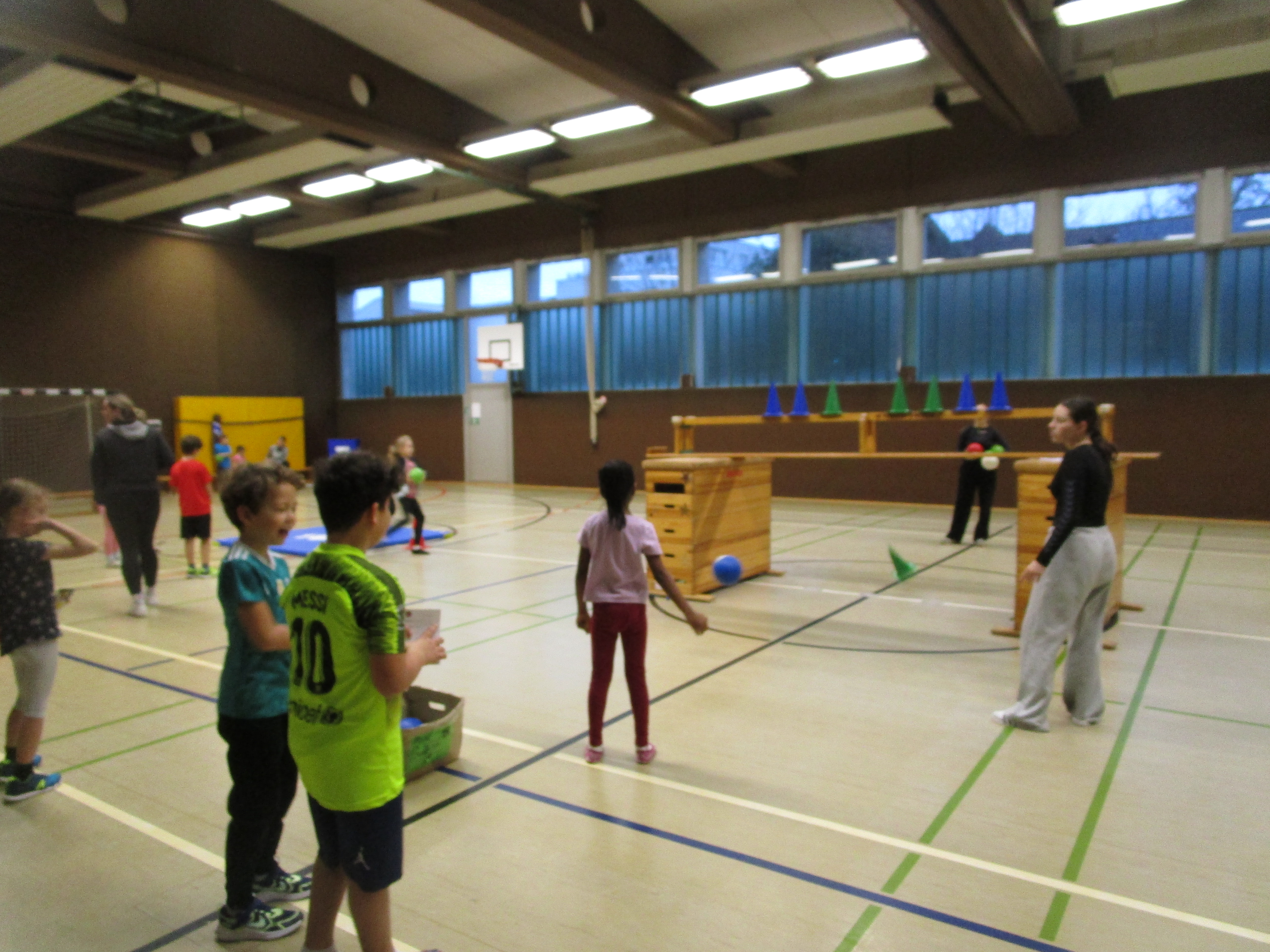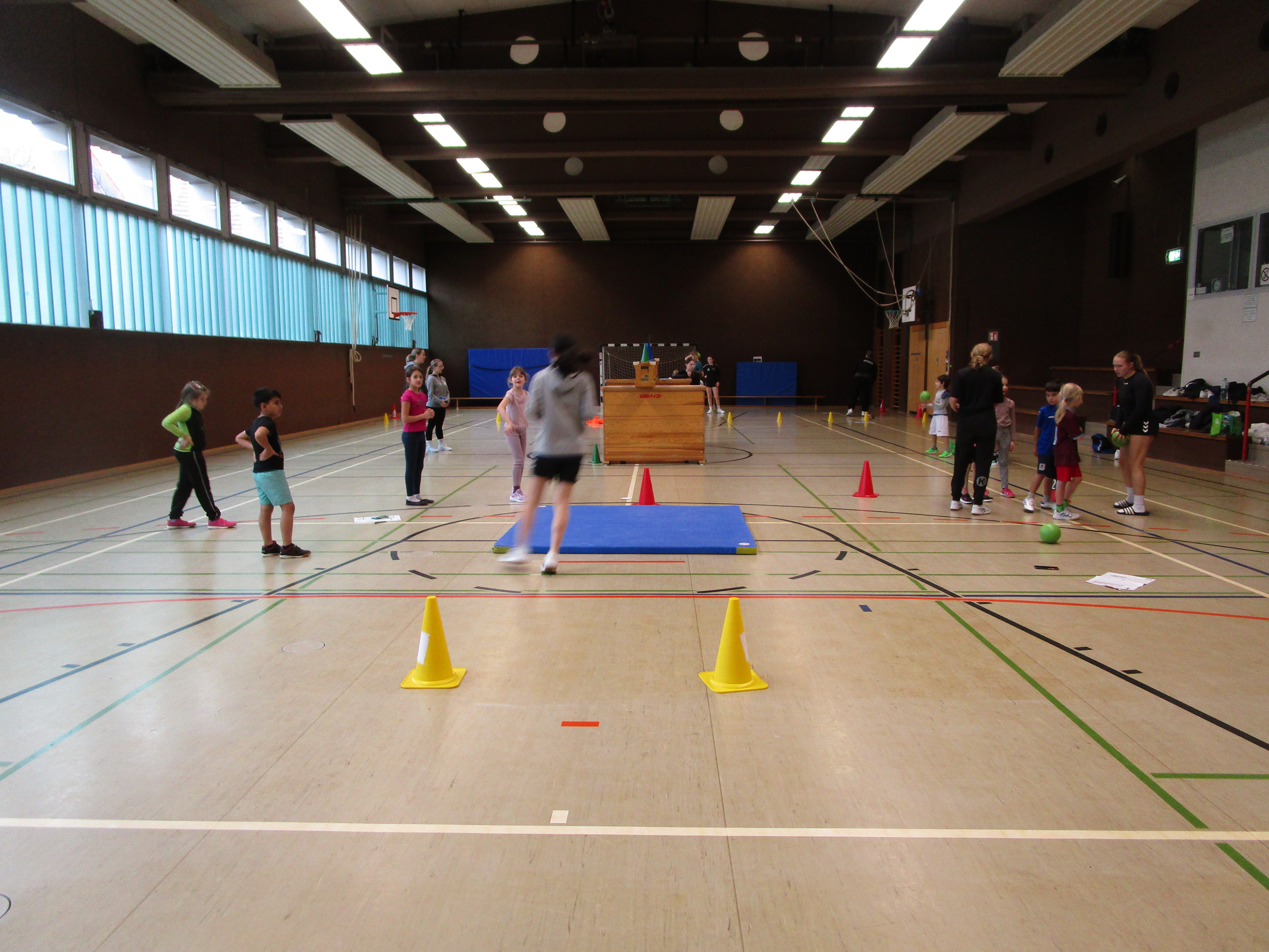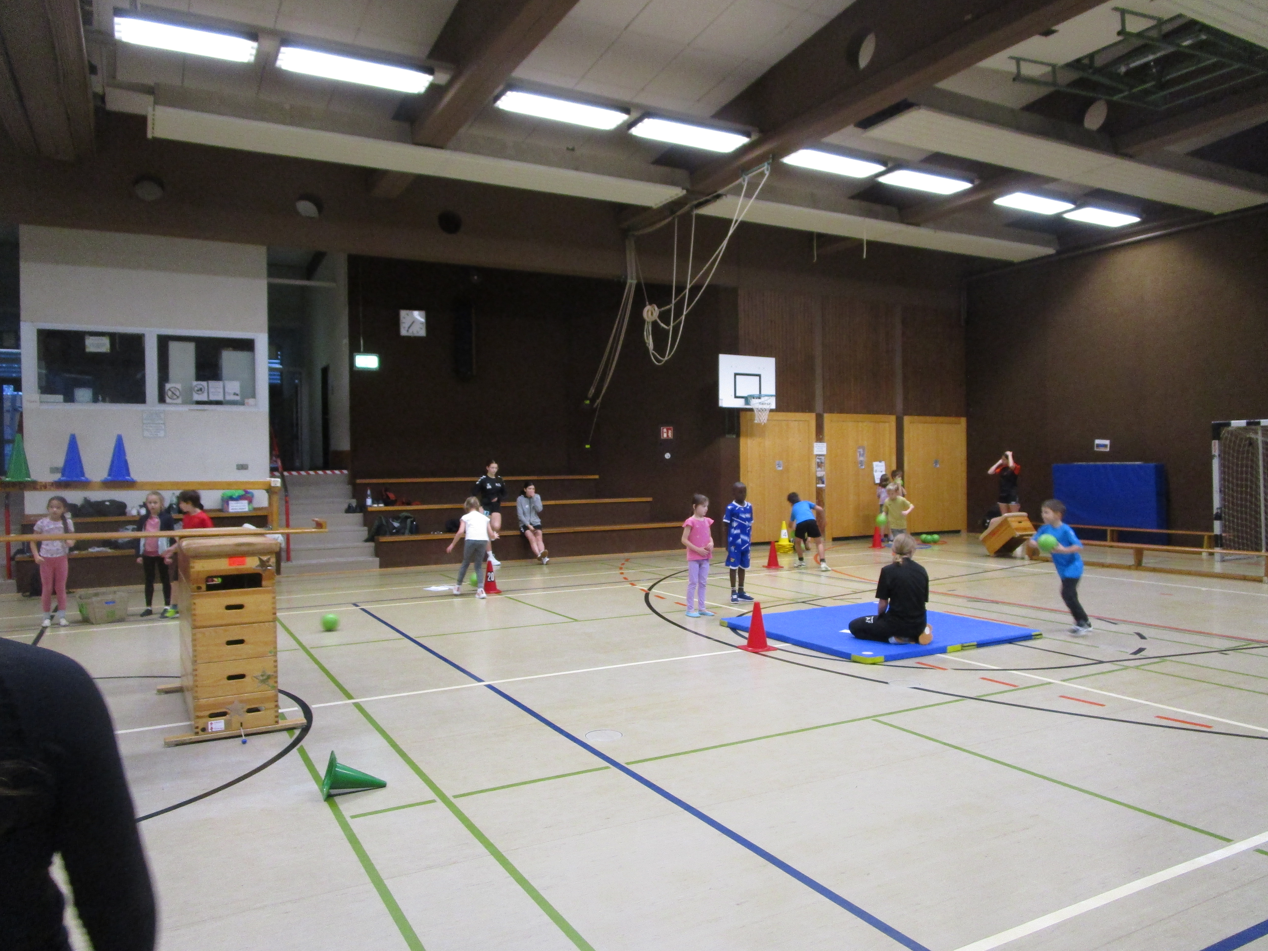 Nach einer kurzen Begrüßung und einer Aufwärmphase, absolvierten die Zweitklässler 6 verschiedene Stationen. Dabei ging es hauptsächlich um Ballgeschicklichkeit, Prellen, Zielwerfen, sowie Fangen und Werfen.