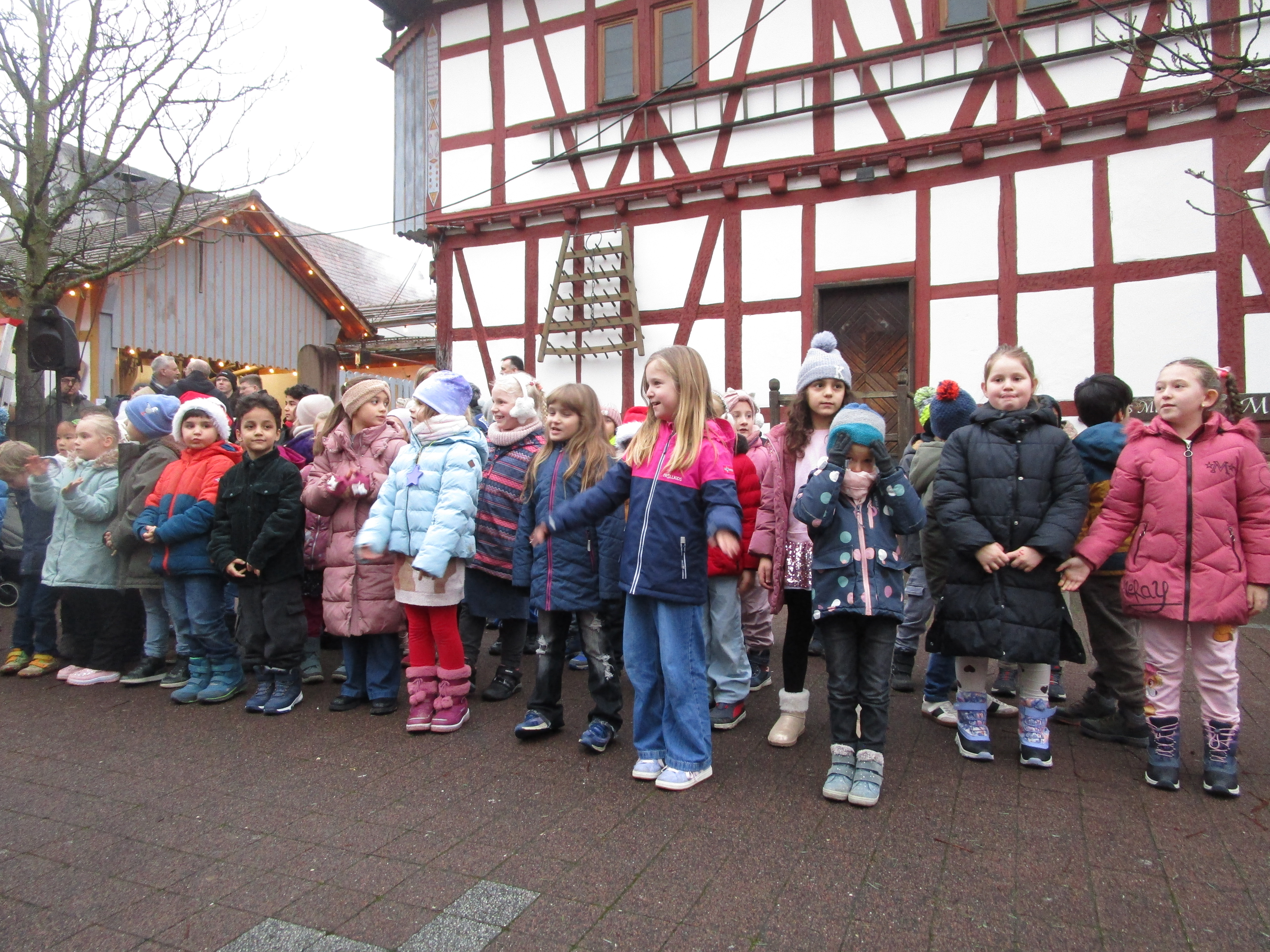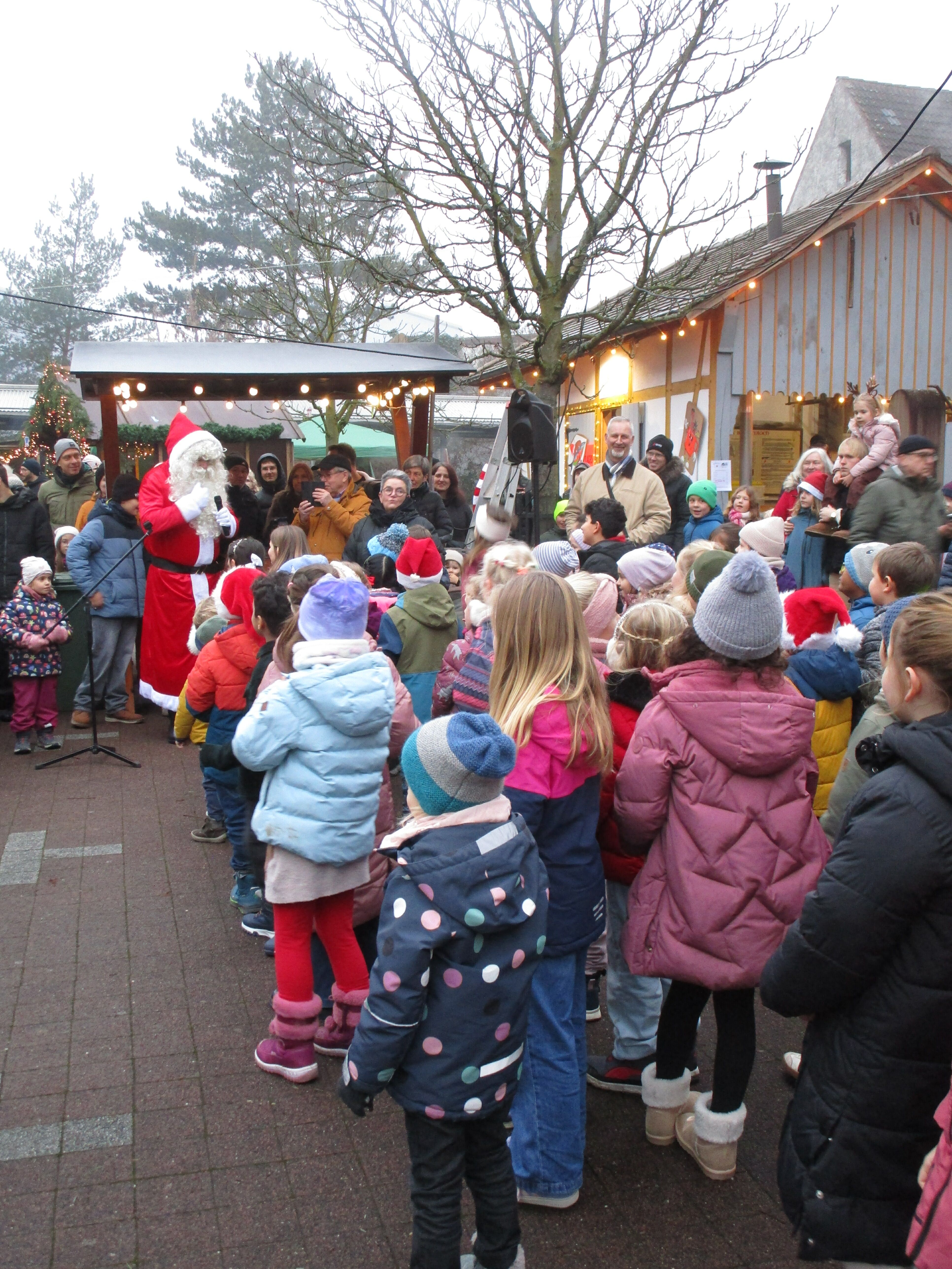 Traditionell eröffneten unsere Erstklässler mit drei Liedern (Eine Tür-Wir tragen dein Licht-Singen wir im Schein der Kerzen) den Blankenlocher Weihnachtsmarkt und bekamen für ihren schönen Auftritt vom Weihnachtsmann einen Dambedei.