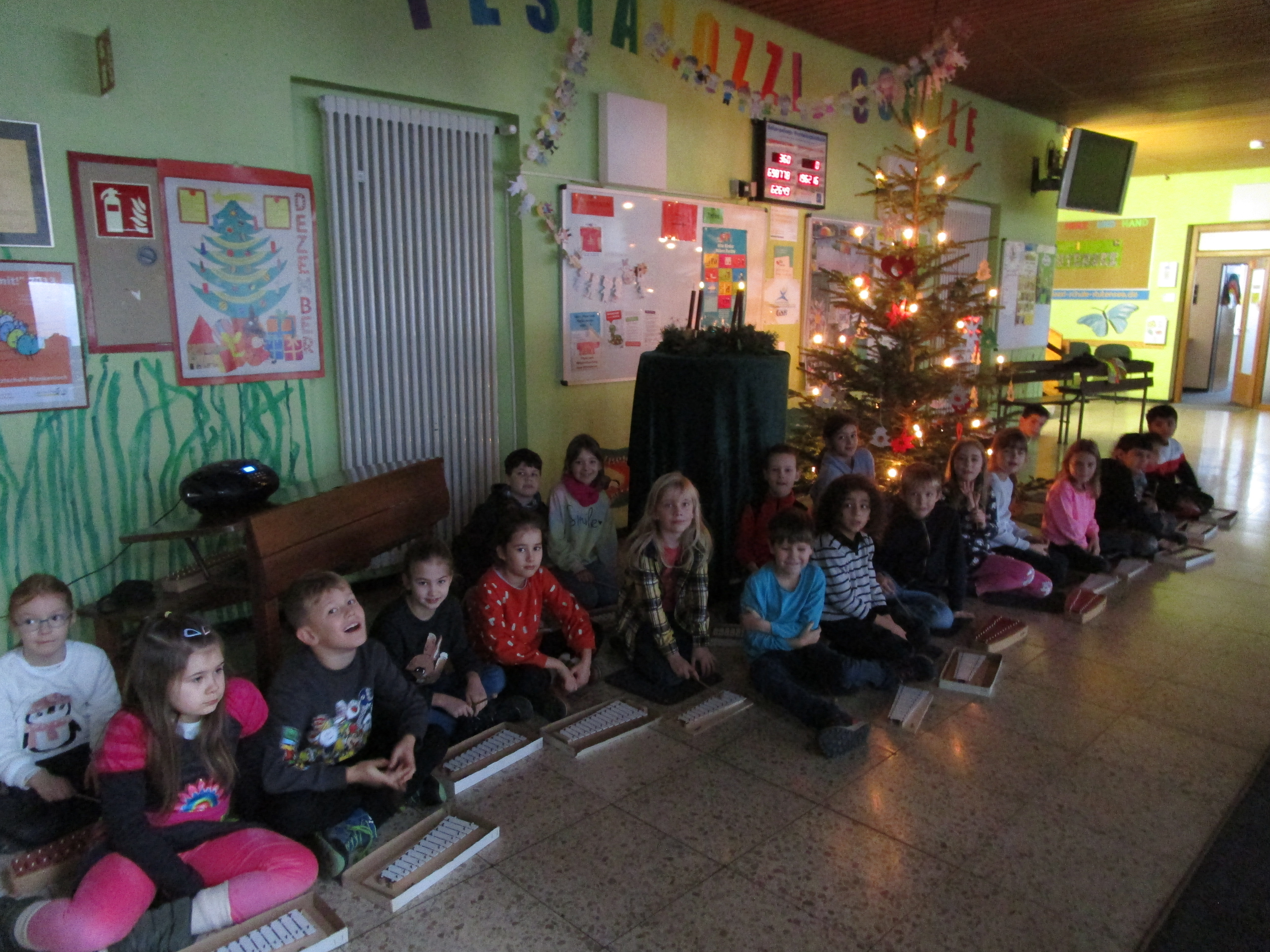 Die Klasse 2c begrüßte zum Start in die Woche die anderen Kinder mit dem Lied Jingle Bells auf dem Glockenspiel.